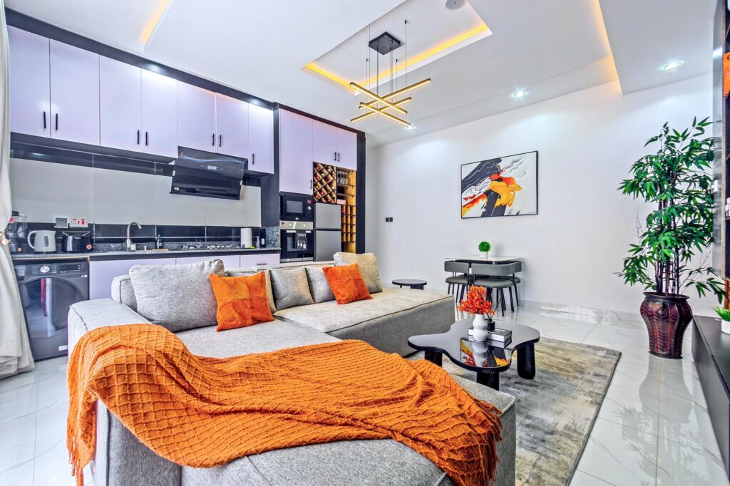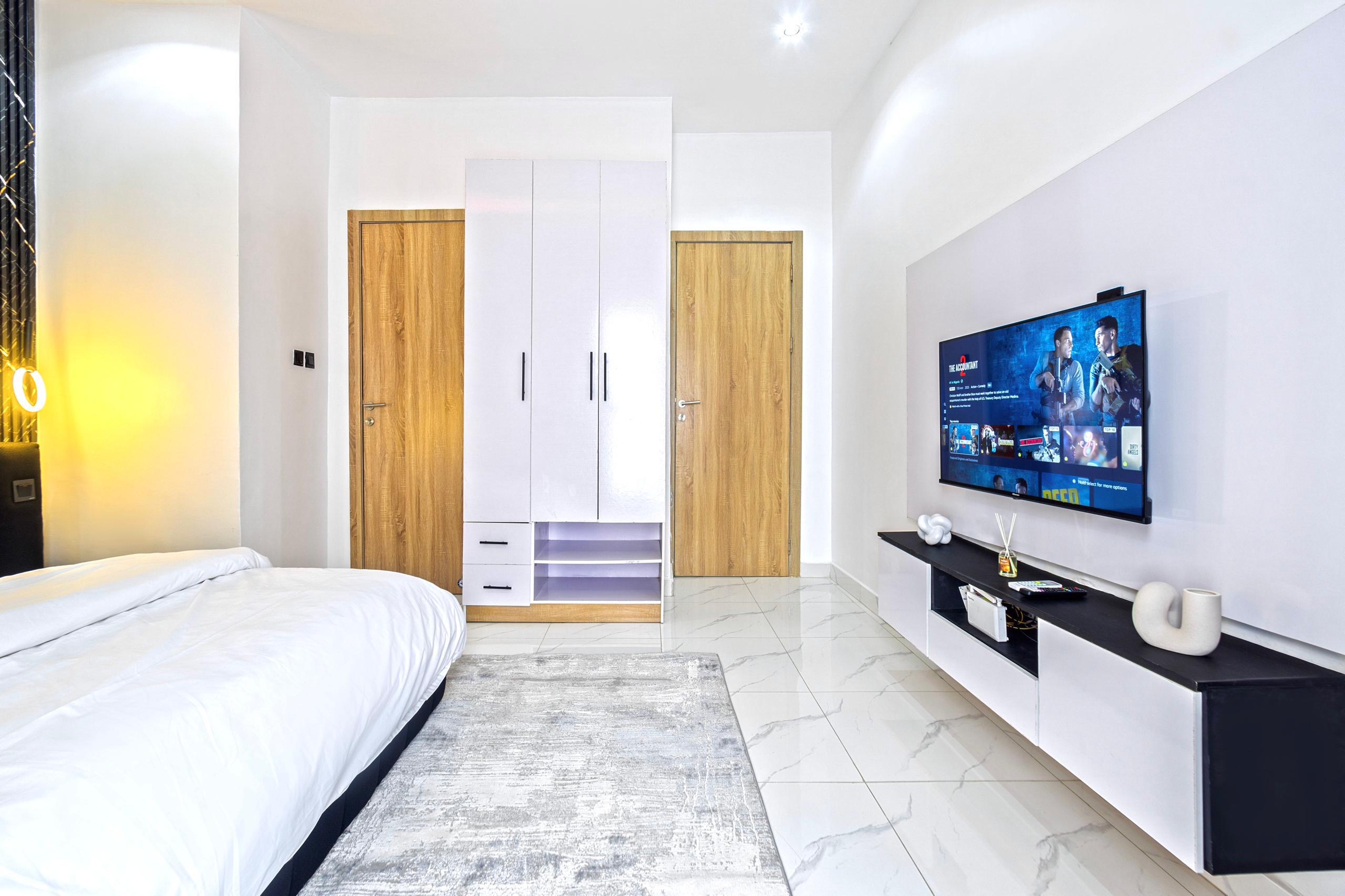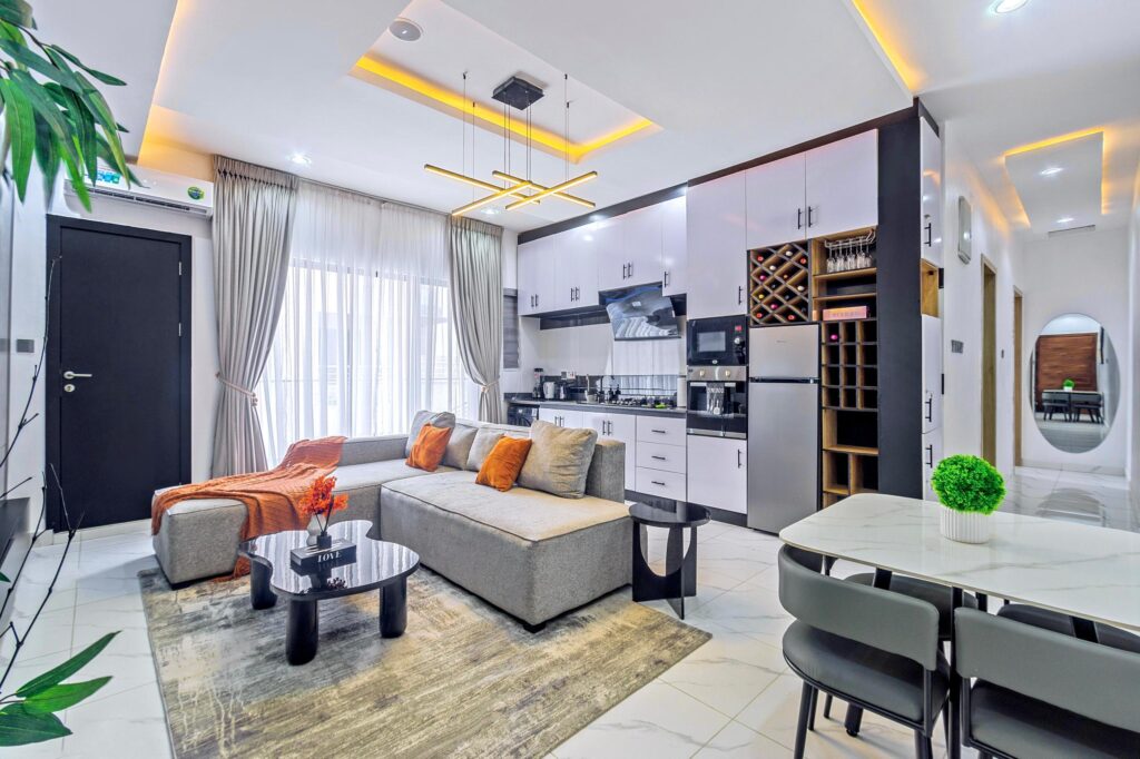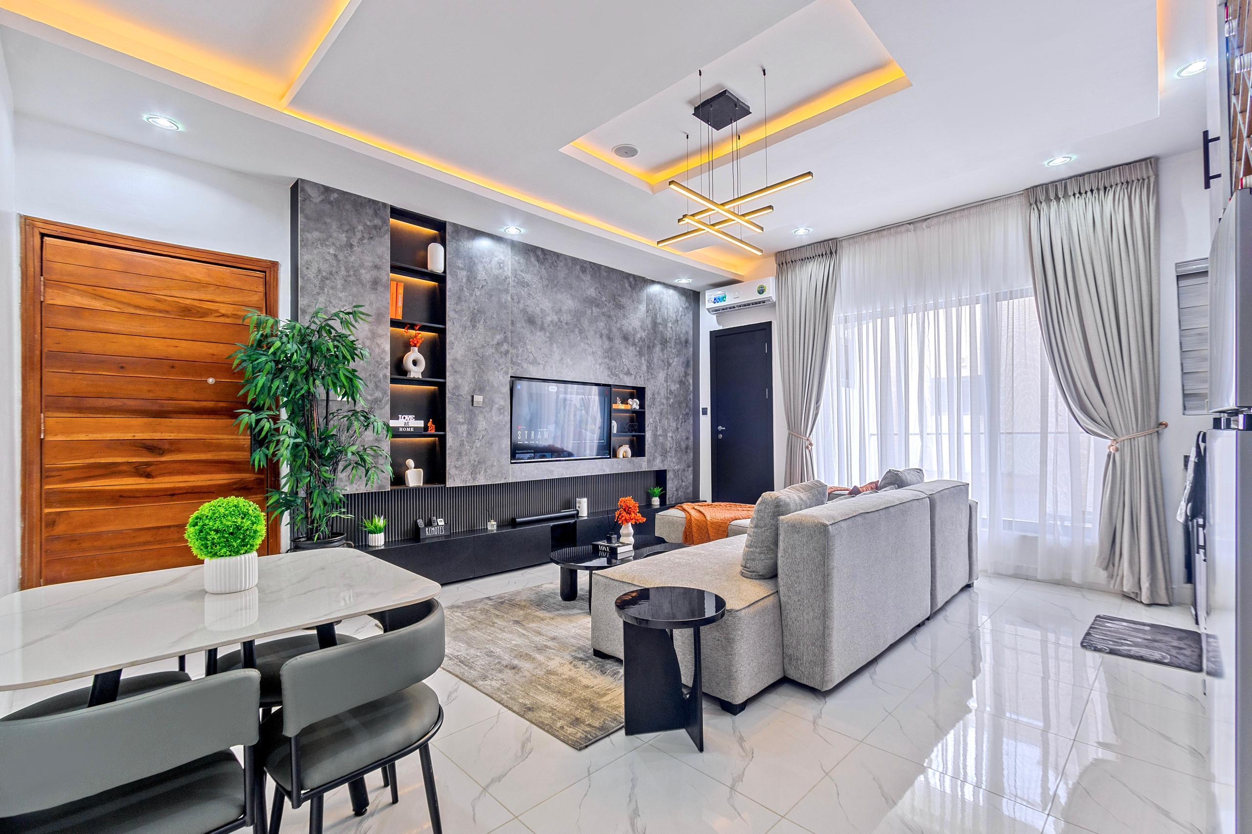 Looking at a getaway staycation or holiday away from home - Book our 2bedroom en-suite bedrooms. The grey apartment in Ikate Lekki boosts of stunning finishings with snookerboard games and aesthetics pleasing to the eyes. With High-speed WiFi, Smart TVs in all rooms, lounge with HD display Fully equipped kitchen: microwave, toaster, kettle, cutlery, tableware