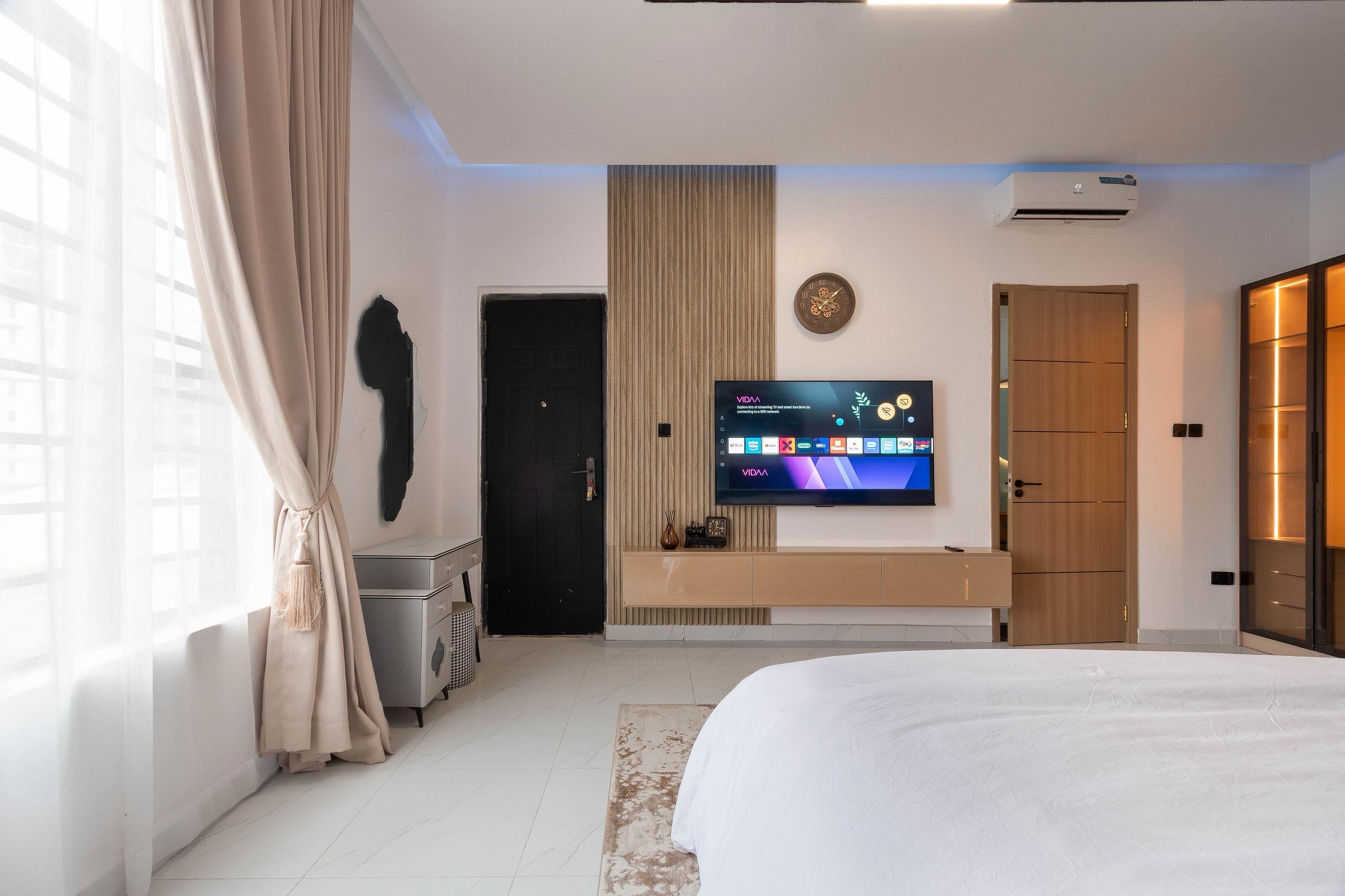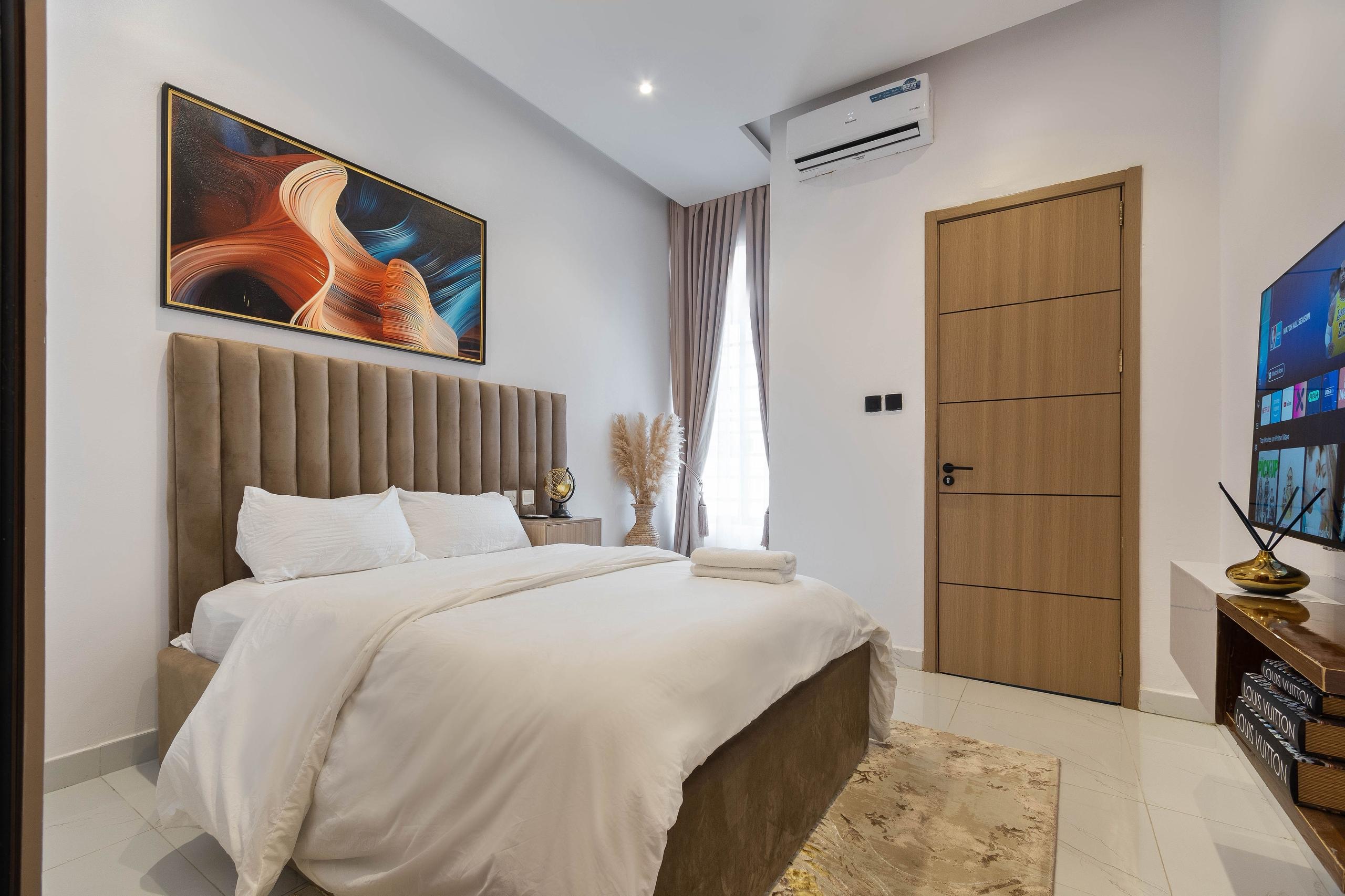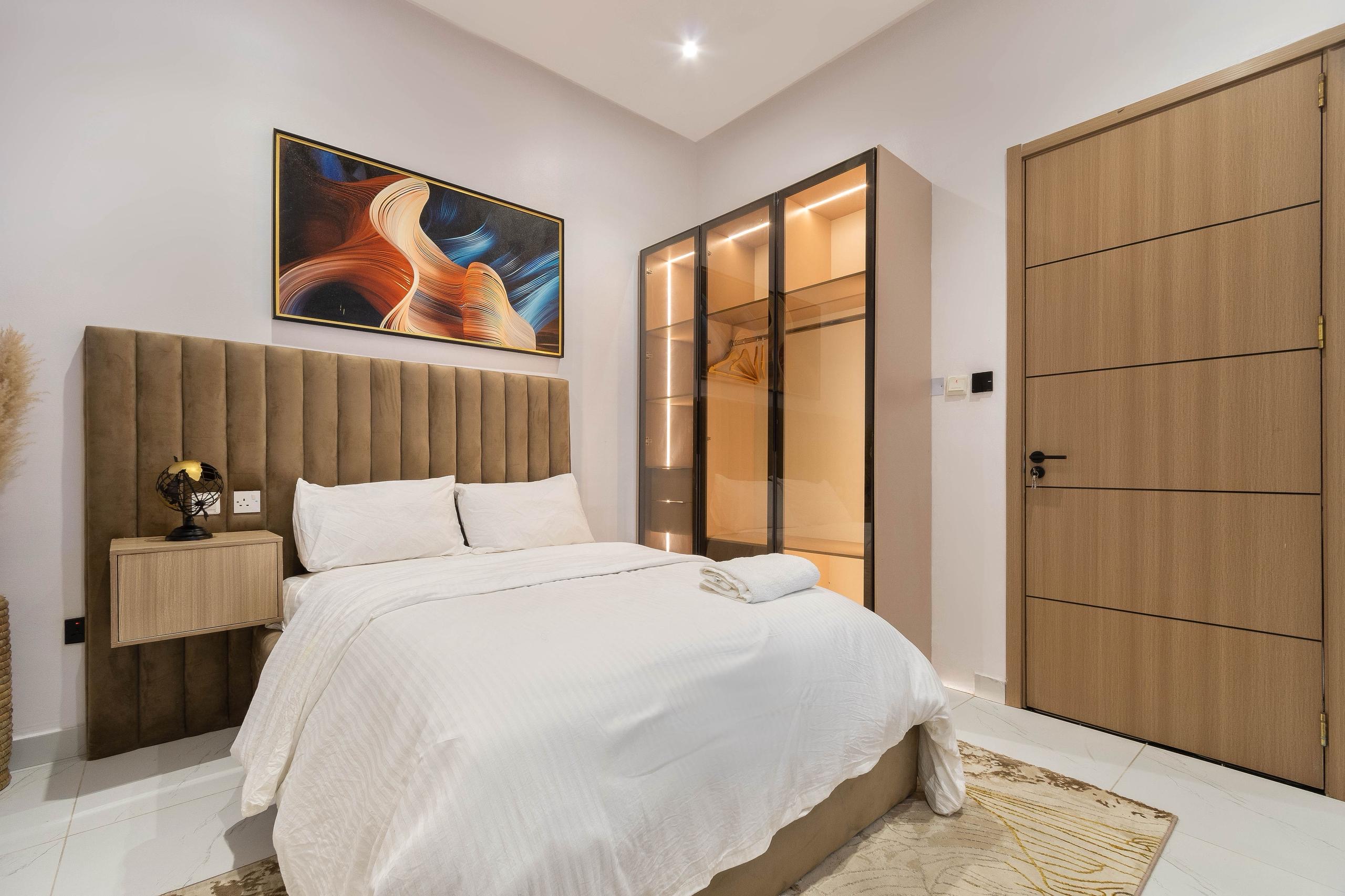Looking at a getaway staycation or holiday away from home – Book our 3-bedroom Terrace Duplex with all en-suite bedrooms. This premium luxury apartment boasts stunning finishes and art display, and aesthetics pleasing to the eye. With High-speed WiFi, Smart TVs in all rooms, a lounge with an HD display fully equipped kitchen: microwave, toaster, kettle, cutlery, tableware. Walk-in closet, washing machine & dryer, central water heating, 24/7 electricity, clean water, housekeeping service.